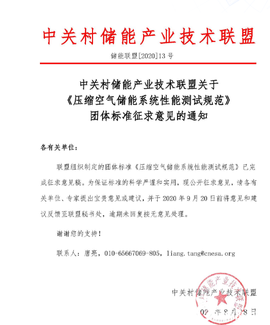 中關(guān)村儲能產(chǎn)業(yè)技術(shù)聯(lián)盟關(guān)于《壓縮空氣儲能系統(tǒng)性能測試規(guī)范》團(tuán)體標(biāo)準(zhǔn)征求意見的通知