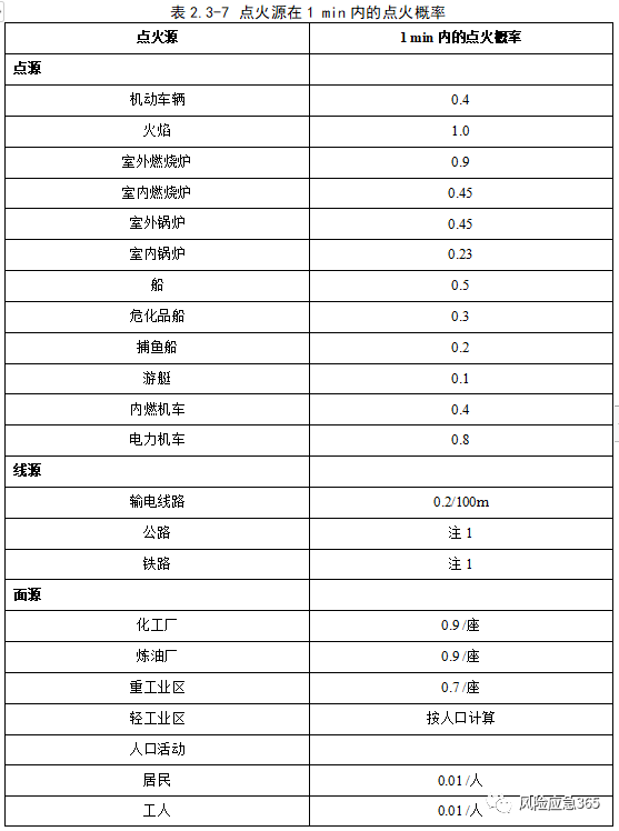 根據(jù)《危險(xiǎn)化學(xué)品生產(chǎn)裝置和儲(chǔ)存設(shè)施外部安全防護(hù)距離確定方法》(GB/T 37243-2019),典型點(diǎn)火源分為:a)點(diǎn)源,如加熱爐(鍋爐)、機(jī)車、火炬、人員;根據(jù)化工園區(qū)情況,點(diǎn)火源主要為人員靜電、違章動(dòng)火、電氣設(shè)施、雷擊、機(jī)動(dòng)車輛、使用工具(鐵質(zhì))不當(dāng)產(chǎn)生火花以及外來火源等。根據(jù)《化工企業(yè)定量風(fēng)險(xiǎn)評(píng)價(jià)導(dǎo)則》(AQ/T 3046-2013)附錄G,立即點(diǎn)火概率與裝置類型、物質(zhì)種類及泄漏(釋放)有關(guān),固定裝置可燃物質(zhì)泄漏后,立即點(diǎn)火概率見下表。延遲點(diǎn)火的點(diǎn)火概率應(yīng)考慮點(diǎn)火源特性、泄漏組分以及點(diǎn)火源處于蒸氣云團(tuán)內(nèi)的概率,不同點(diǎn)火源在1min內(nèi)的點(diǎn)火概率見下表。