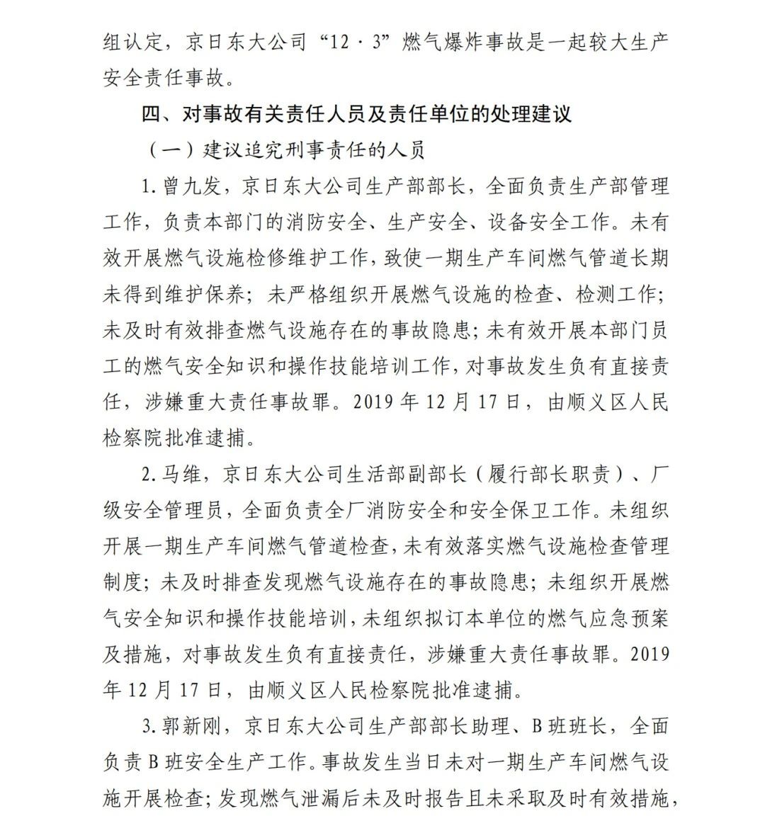 1.曾九發(fā),京日東大公司生產部部長,全面負責生產部管理工作,負責本部門的消防安全、生產安全、設備安全工作。未有效開展燃氣設施檢修維護工作,致使一期生產車間燃氣管道長期未得到維護保養(yǎng);未嚴格組織開展燃氣設施的檢查、檢測工作;未及時有效排查燃氣設施存在的事故隱患;未有效開展本部門員工的燃氣安全知識和操作技能培訓工作,對事故發(fā)生負有直接責任,涉嫌重大責任事故罪。2019 年 12 月 17 日,由順義區(qū)人民 檢察院批準逮捕。