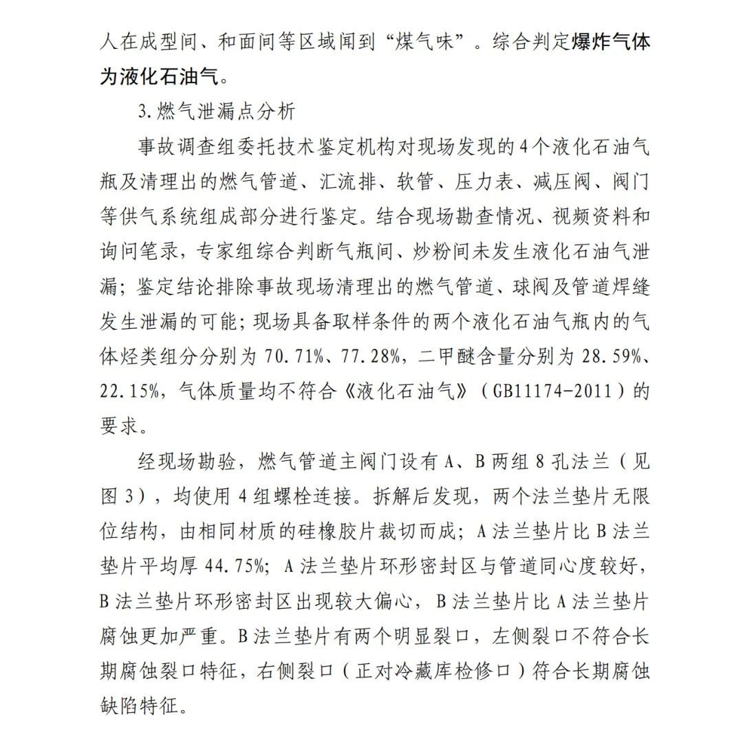 本次事故的直接原因為:京日東大公司一期生產車間燃氣管道主閥門A、B法蘭墊片為甲基乙烯基硅橡膠材質,受管道內液化石油氣和二甲醚混合氣體長期腐蝕,墊片物理機械性能下降,發(fā)育出微小裂隙并逐漸增長,局部發(fā)生破損脫落;在管道內部壓力作用下,B墊片發(fā)生撕裂并形成泄漏口,泄漏出的氣體與空氣混合,在冷藏庫內外空間形成爆炸性混合氣體,遇電氣火花等點火源發(fā)生爆炸,并引燃現(xiàn)場可燃物,導致事故發(fā)生。