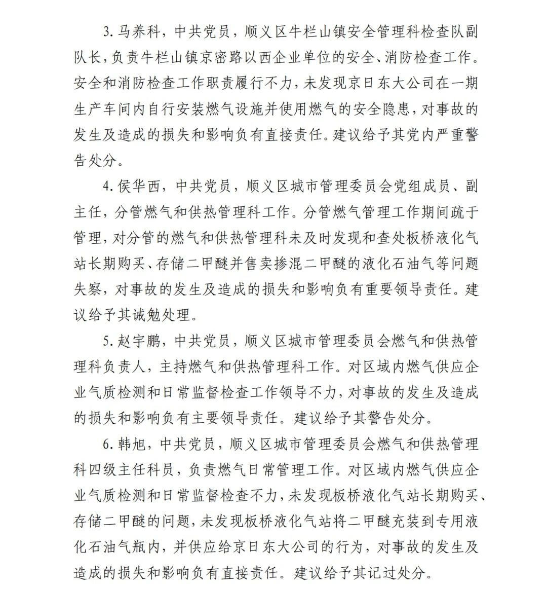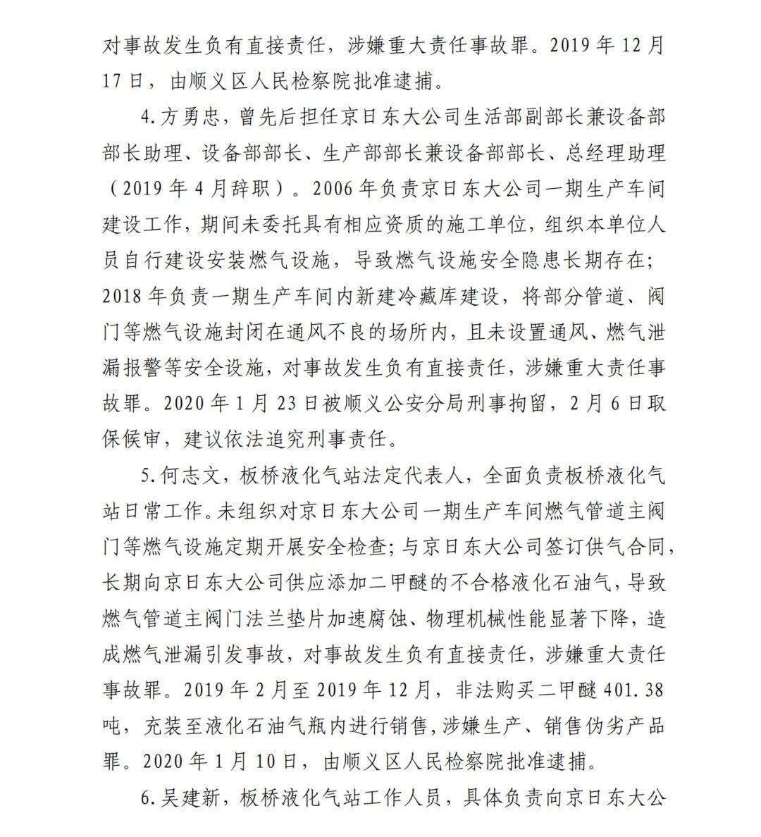 4.方勇忠,曾先后擔任京日東大公司生活部副部長兼設備部部長助理、設備部部長、生產部部長兼設備部部長、總經(jīng)理助理(2019年4月辭職)。2006年負責京日東大公司一期生產車間建設工作,期間未委托具有相應資質的施工單位,組織本單位人員自行建設安裝燃氣設施,導致燃氣設施安全隱患長期存在;2018 年負責一期生產車間內新建冷藏庫建設,將部分管道、閥門等燃氣設施封閉在通風不良的場所內,且未設置通風、燃氣泄漏報警等安全設施,對事故發(fā)生負有直接責任,涉嫌重大責任事 故罪。2020 年 1 月 23 日被順義公安分局刑事拘留,2 月 6 日取 保候審,建議依法追究刑事責任。