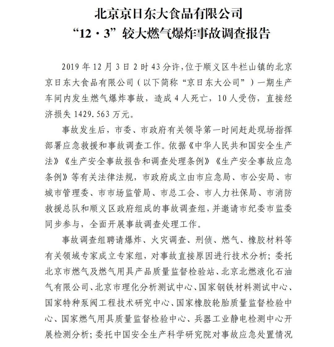 2019年12月3日2時43分許,北京順義區(qū)牛欄山鎮(zhèn)的(以下簡稱“京日東大公司”)一期生產車間內發(fā)生燃氣爆炸事故,造成4人死亡,10人受傷,直接經(jīng)濟損失1429.563萬元。