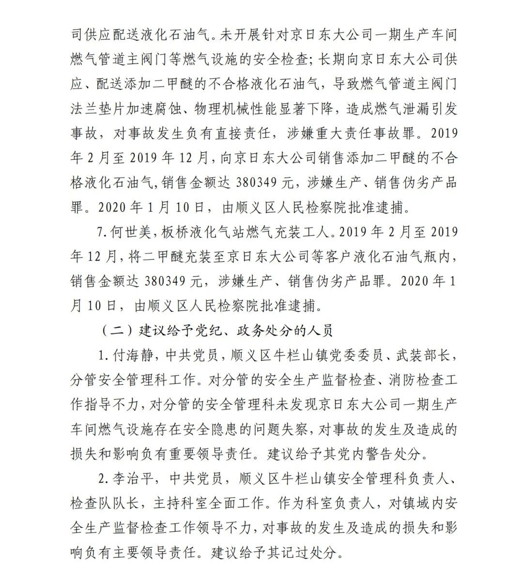 6.吳建新,板橋液化氣站工作人員,具體負責向京日東大公15司供應配送液化石油氣。未開展針對京日東大公司一期生產車間燃氣管道主閥門等燃氣設施的安全檢查;長期向京日東大公司供應、配送添加二甲醚的不合格液化石油氣,導致燃氣管道主閥門法蘭墊片加速腐蝕、物理機械性能顯著下降,造成燃氣泄漏引發(fā) 事故,對事故發(fā)生負有直接責任,涉嫌重大責任事故罪。2019 年 2 月至 2019 年 12 月,向京日東大公司銷售添加二甲醚的不合 格液化石油氣,銷售金額達 380349 元,涉嫌生產、銷售偽劣產品 罪。2020 年 1 月 10 日,由順義區(qū)人民檢察院批準逮捕。