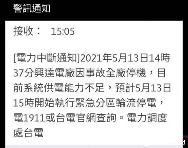 報道稱,由于全廠停機,供電量不足緊急分區(qū)輪流供電,也造成全臺各地大停電,包括臺中、苗栗、桃園、基隆、新竹、宜蘭、高雄,目前都有部分區(qū)域停電,還有臺北內(nèi)湖、新北土城,都有網(wǎng)友爆料停電中。