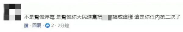 也有網(wǎng)友怒斥民進(jìn)黨當(dāng)局:不是驚慌停電,是驚慌你民進(jìn)黨把臺灣搞成這樣,這是你任內(nèi)第二次了?!?/p>