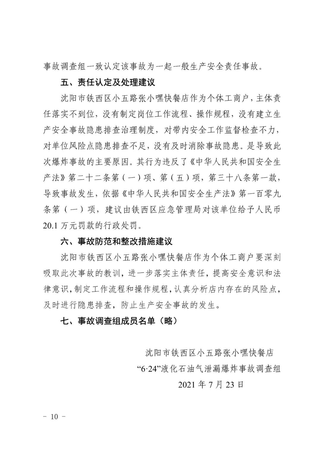 2021 年 6 月 24 日 4 時 11 分左右,位于沈陽市鐵西區(qū)小五路 54 號 3 門,沈陽市鐵西區(qū)小五路張小嘿快餐店內(nèi)發(fā)生液化石油氣泄漏爆炸,無人員傷亡,直接經(jīng)濟損失 70 余萬元。