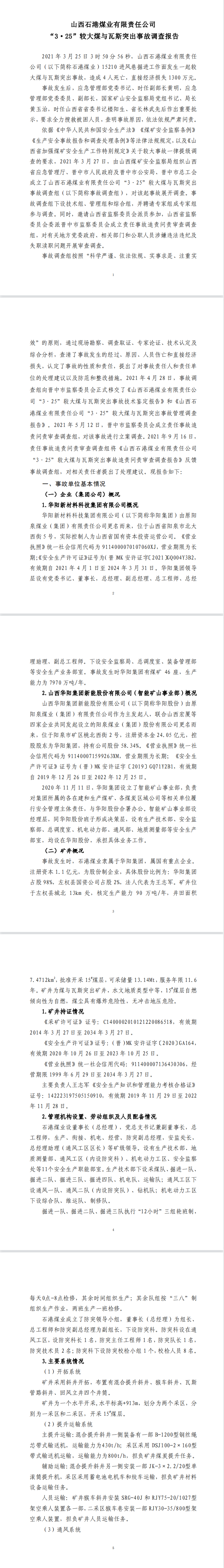 2021年3月25日,山西華陽集團(tuán)石港煤業(yè)有限公司(以下簡稱石港煤業(yè))15210進(jìn)風(fēng)巷掘進(jìn)工作面發(fā)生煤與瓦斯突出事故,突出煤(矸)量為244t、瓦斯量為22882m3,造成4人死亡,直接經(jīng)濟(jì)損失1300萬元,事故后遲報。