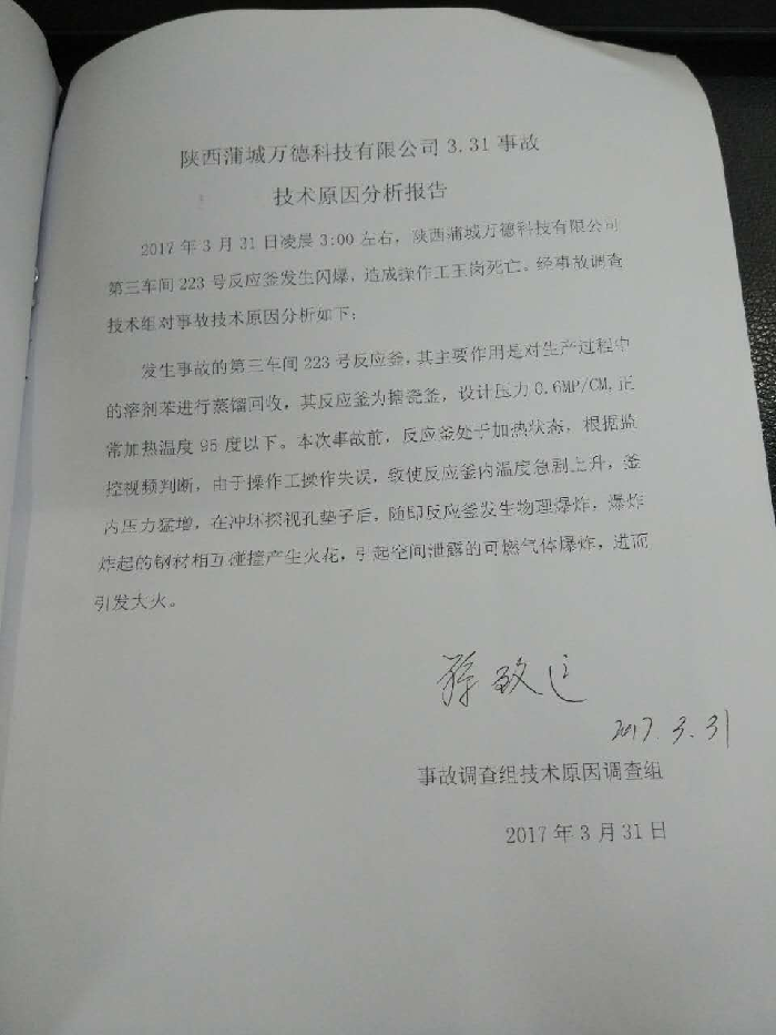 2017年3月31日凌晨3:00左右,蒲城萬德科技有限公司第三車間223反應(yīng)釜發(fā)生閃爆,引發(fā)第三車間著火,造成一起1名夜班工人死亡。事故發(fā)生后,該公司值班領(lǐng)導(dǎo)向公司領(lǐng)導(dǎo)進(jìn)行了報(bào)告,該公司立即啟動(dòng)了《生產(chǎn)安全事故應(yīng)急救援預(yù)案》,組織工人啟動(dòng)消防水泵進(jìn)行現(xiàn)場救援,組織廠區(qū)其他工人撤出生產(chǎn)廠區(qū),同時(shí)向110、119、120請(qǐng)求救援,向相關(guān)政府部門進(jìn)行了報(bào)告。接到報(bào)告后,縣公安局陳莊派出所、安監(jiān)局、蒲城高新區(qū)管委會(huì)、消防大隊(duì)、120急救部門第一時(shí)間趕到現(xiàn)場進(jìn)行救援處置,凌晨4時(shí)20分左右成功撲滅事故現(xiàn)場明火。隨后該公司組織在第三車間二樓平臺(tái)找到王崗的尸體,證實(shí)該名工人在爆炸中當(dāng)場死亡。