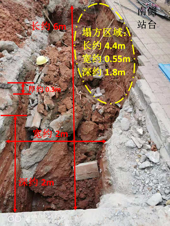 溝槽南側(cè)惠豐城公交站臺(tái)鋪磚區(qū)下方基坑側(cè)壁有坍塌現(xiàn)象,塌方長度約為4.4m,寬度約0.55m,深度約1.8m,溝槽北側(cè)龍海二路硬化路面處完好。(見圖二)