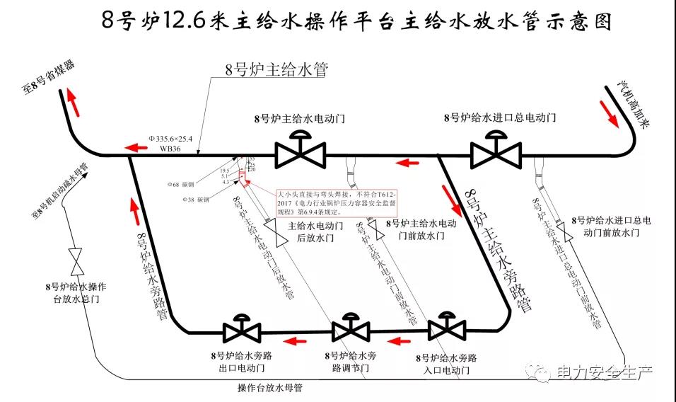 在 8 號機組鍋爐主給水管道放水管漏點處理過程中,放水管突然爆漏,高溫水汽大量噴出,導致工作現(xiàn)場3 人不同程度燙傷,其中1 人在躲避高溫水汽過程中從12.6 米作業(yè)平臺墜落至鍋爐0 米地面,經(jīng)搶救無效死亡;1人送醫(yī)救治8 天后死亡。