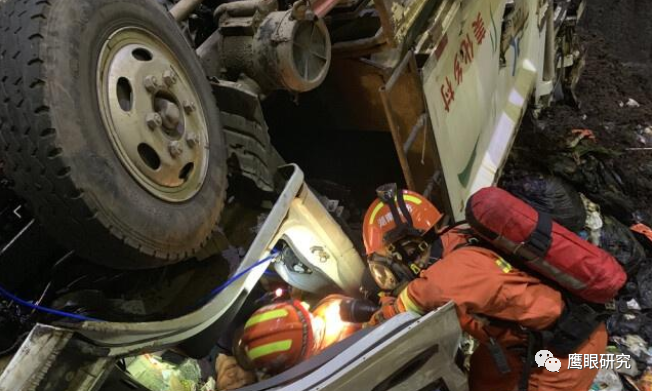 首批消防救援人員趕到現(xiàn)場了解得知,垃圾庫長 48 米、寬 20 米,總深度為 23 米,車輛從卸料平臺跌落至 12 米處的垃圾斜坡地段,呈車頂朝下、車底盤朝上倒翻狀態(tài),而且處于在垃圾坡度為 40 度左右的大斜坡上,隨時有更一步往下翻車至浸水區(qū)的危險。現(xiàn)場指揮員通過前期勘查,咨詢現(xiàn)場工作人員垃圾廢料區(qū)有無致命氣體危險等相關情況后,迅速命令 4 名救援人員佩戴空氣呼吸器,攜帶破拆工具、有毒氣體探測儀、多功能救援擔架等救援設備利用軟梯、繩索下到事故救援點。由于車輛嚴重變形,導致救援操作困難被困者一時無法移出。