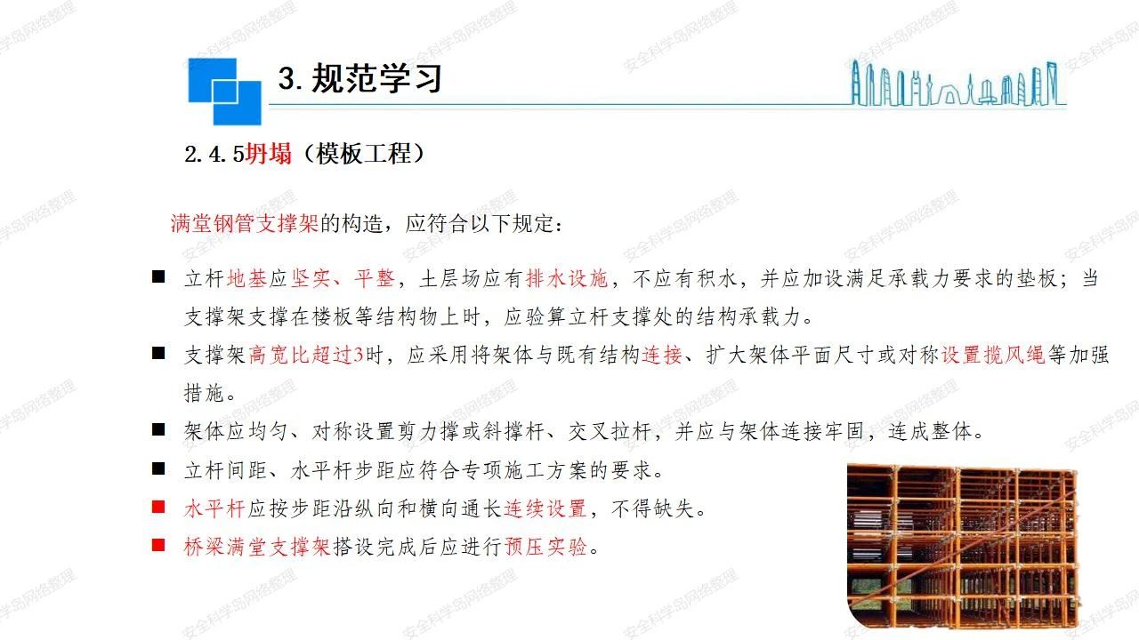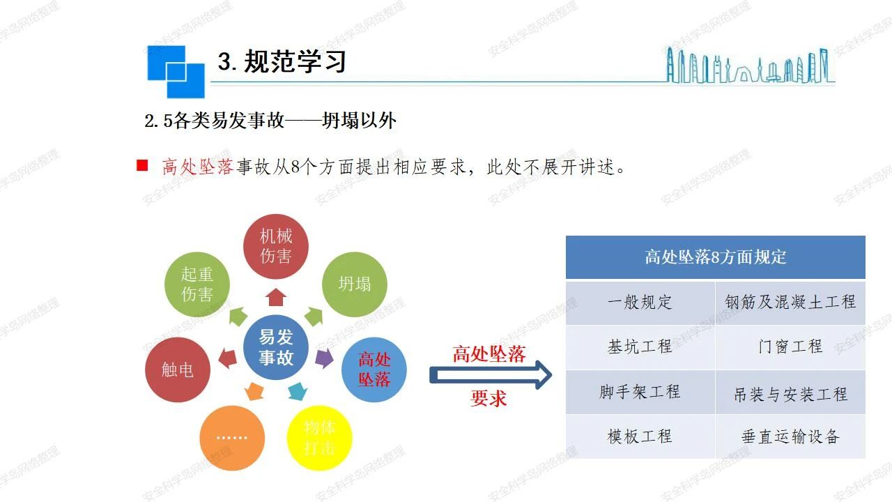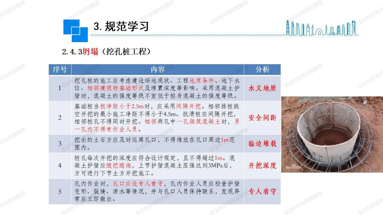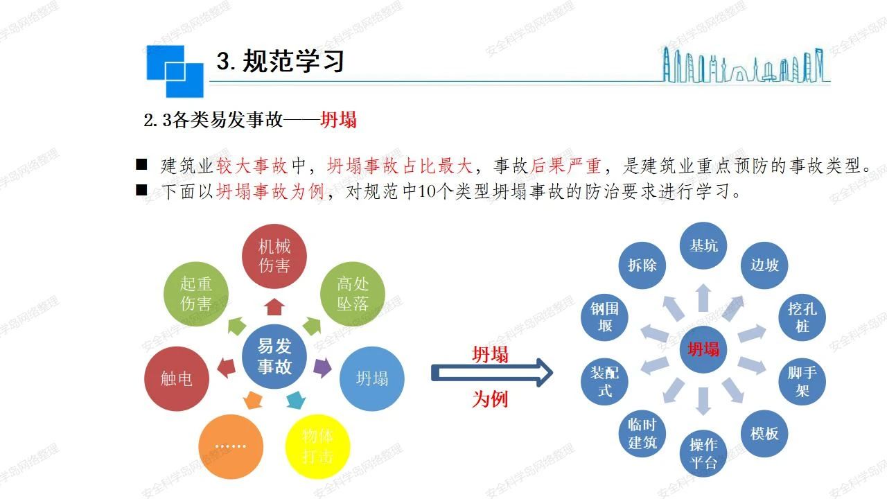 那么,坍塌事故發(fā)生的原因何在? (1)工程結(jié)構(gòu)設(shè)計(jì)不合理或計(jì)算失誤。 (2)施工前沒(méi)有編制切實(shí)可行的施工組織設(shè)計(jì)和專(zhuān)項(xiàng)施工方案,未做具體技術(shù)安全措施交底,特定施工項(xiàng)目未經(jīng)專(zhuān)家評(píng)審論證。 (3)腳手架、模板支撐、起重設(shè)備結(jié)構(gòu)設(shè)計(jì)不合理或計(jì)算失誤。 (4)建筑物結(jié)構(gòu)質(zhì)量低劣,安全性能差,地基不穩(wěn)定,不均勻沉降。 (5)建筑物結(jié)構(gòu)支撐連接(焊接)不牢固,超載、外力沖擊或嚴(yán)重偏心載荷造成失穩(wěn)等。 (6)腳手架及高大模板支架架體結(jié)構(gòu)不符合設(shè)計(jì)與規(guī)范要求,整體安全穩(wěn)定性差、超載或嚴(yán)重偏心荷載,遇外力沖擊或振動(dòng),不按程序拆除架體等因素造成失穩(wěn)等。 (7)基坑、土石方挖土?xí)r土壁不按規(guī)定留設(shè)邊坡(甚至負(fù)坡度),缺乏支護(hù)或支護(hù)不良,土質(zhì)不良或出現(xiàn)地下水、地表水的滲透,土壁經(jīng)不起重載側(cè)壓力或遇外力振動(dòng)、沖擊等因素造成土壁失穩(wěn)滑坡坍塌。 (8)起重設(shè)備技術(shù)安全性能差,結(jié)構(gòu)強(qiáng)度不夠,安全防護(hù)裝置不完善,垂直起重機(jī)與建筑物拉結(jié)差,出現(xiàn)超載、碰撞、升降過(guò)度或違章操作等原因,造成起重設(shè)備倒塌。 (9)現(xiàn)場(chǎng)作業(yè)環(huán)境不良,安全防護(hù)設(shè)施缺乏。 (10)施工現(xiàn)場(chǎng)管理松弛,各項(xiàng)質(zhì)量、安全管理制度流于形式。 (11)片面追求經(jīng)濟(jì)利益,偷工減料,施工質(zhì)量差。 (12)施工隊(duì)伍素質(zhì)差,不執(zhí)行法規(guī)、標(biāo)準(zhǔn),違章指揮、違章作業(yè),思想上存在盲目性、冒險(xiǎn)性、隨意性。 如何預(yù)防坍塌事故? (1)根據(jù)設(shè)計(jì)與規(guī)范要求,認(rèn)真編制施工組織設(shè)計(jì)和專(zhuān)項(xiàng)施工技術(shù)方案、應(yīng)急預(yù)案,做好特定施工項(xiàng)目專(zhuān)家評(píng)審論證及技術(shù)安全交底工作。 (2)支架、腳手架等搭設(shè)完成后應(yīng)組織相關(guān)部門(mén)驗(yàn)收。支架還應(yīng)按方案要求進(jìn)行堆載預(yù)壓。 (3)嚴(yán)格控制模板支架、腳手架等承受的荷載,模板、腳手架及其支撐體系的施工荷載應(yīng)做到均勻分布,并不得超過(guò)設(shè)計(jì)要求。嚴(yán)禁超載、對(duì)構(gòu)筑物進(jìn)行外力沖擊或偏心載荷。 (4)基坑、土石方挖土?xí)r土壁按規(guī)定留設(shè)邊坡,嚴(yán)格按照設(shè)計(jì)坡度進(jìn)行放坡開(kāi)挖,進(jìn)行有效支護(hù)和排水,并設(shè)置專(zhuān)人對(duì)邊坡穩(wěn)定性進(jìn)行檢測(cè)?;討?yīng)基坑頂邊緣1m范圍內(nèi)禁止堆放材料。 (5)加強(qiáng)起重設(shè)備的采購(gòu)管理,嚴(yán)禁使用不合格的起重設(shè)備,并定期進(jìn)行檢測(cè),確保各項(xiàng)性能和安全防護(hù)裝置良好;加強(qiáng)起重設(shè)備的安裝、拆除管理;加強(qiáng)起重設(shè)備的使用管理,嚴(yán)禁超載、碰撞或違章操作;加強(qiáng)對(duì)起重設(shè)備操作人員、指揮人員、安拆人員的安全教育培訓(xùn),考核合格后持證上崗。 (6)加強(qiáng)施工現(xiàn)場(chǎng)管理,設(shè)置有效安全防護(hù)設(shè)施。 (7)加強(qiáng)對(duì)從業(yè)人員的培訓(xùn)教育,提高隊(duì)伍素質(zhì),強(qiáng)化質(zhì)量、安全意識(shí)。 (8)強(qiáng)化工程質(zhì)量報(bào)驗(yàn)和檢驗(yàn)、簽證制度,不經(jīng)檢驗(yàn)合格,不準(zhǔn)進(jìn)行下道工序施工。 (9)發(fā)現(xiàn)坍塌事故的險(xiǎn)情,要認(rèn)真分析原因,積極研究提出排除隱患的整改措施,并監(jiān)督執(zhí)行。