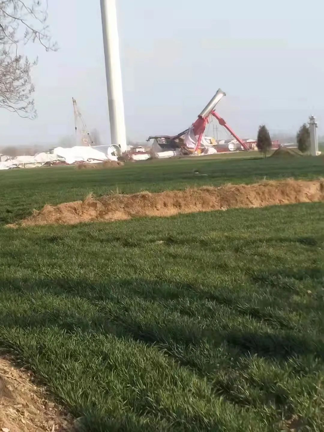 龐大的吊車摔得面目全非風機組破損嚴重,這次損失十分嚴重現場已經拉起了警戒線,吊車車身已覆蓋遮擋布