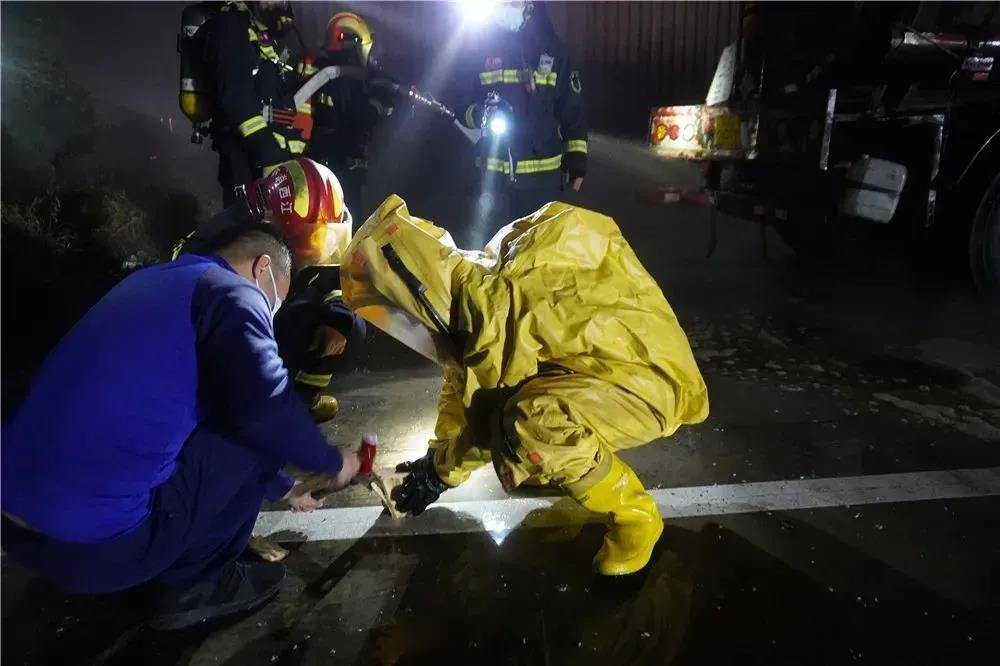 隨后,消防救援人員設(shè)置水槍陣地對空氣中的鹽酸進行稀釋處置,并協(xié)調(diào)相關(guān)聯(lián)動單位調(diào)來石灰和沙土對泄露鹽酸進行堵截。經(jīng)過5個小時的持續(xù)處置,現(xiàn)場環(huán)境監(jiān)測部門監(jiān)測確認無危害后,消防救援人員移交現(xiàn)場。
