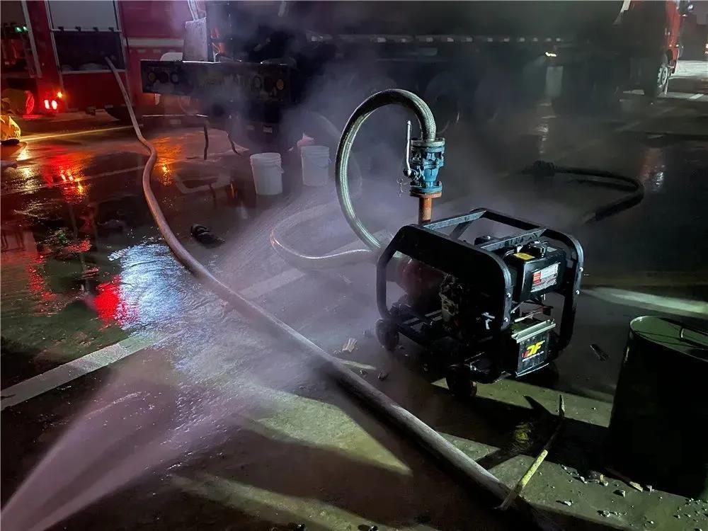 與此同時,戰(zhàn)斗員穿戴好防化服,在水槍的掩護下帶著無火花快速堵漏器材靠近閥門實施堵漏作業(yè)。經(jīng)過47分鐘的努力,22時30分,堵漏成功,隨后前方指揮部安排儲罐車對泄露鹽酸車輛進行倒罐處置。